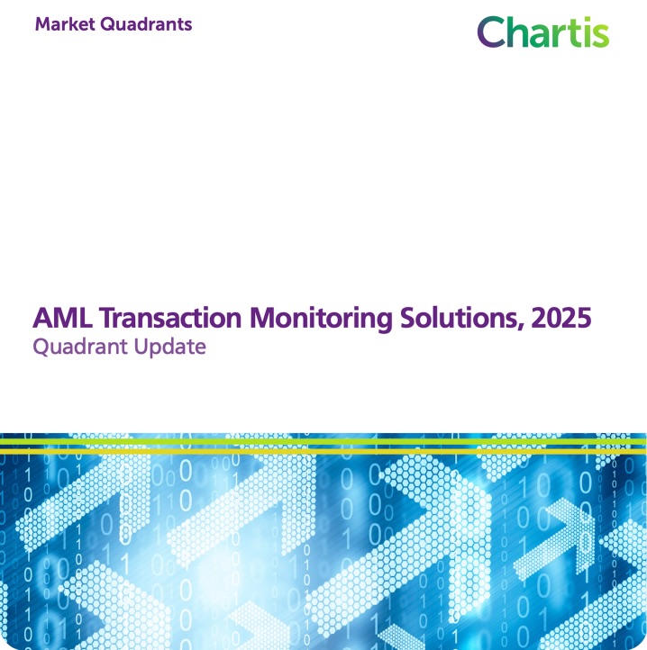 Cover of "AML Transaction Monitoring Solutions, 2025: Quadrant Update" by Chartis, featuring digital security graphics with data patterns.